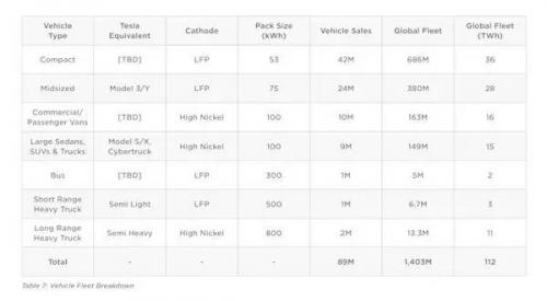 据悉,特斯拉新款小型电动汽车将配备53kWh磷酸铁锂(LFP)电池,目标销量4200万辆。中型汽车(如Model 3/Y)将配备75kWh磷酸铁锂电池,目标销量2400万辆。大型三厢车、SUV和货车(如Model S/X及Cybertruck(参数|询价)电动皮卡)将配备100kWh高镍电池,目标销量900万辆。长续航重卡(如特斯拉Semi重型)将配备800kWh高镍电池,目标销量200万辆。