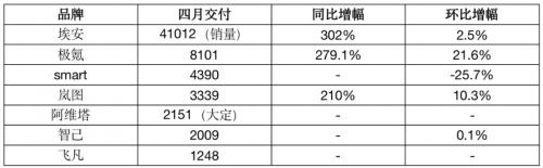 来自车企官方数据显示,可以看到埃安的数据比较亮眼,4月销售新车41012辆,连续第二个月销量突破4万辆,同比增长302%,环比增长2.5%。不过埃安一直以来都提的是销量,而非交付量,去除一定的“水分”后依然保持在较高的水平,算是传统车企的新能源品牌比较成功的。