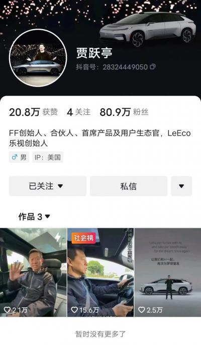 一个中年男人开通了抖音账号,只关注了前妻和自己的公司,发了三条视频就收获了80多万粉丝,贾跃亭如今在互联网上的关注度,丝毫不输任何流量明星,甚至能和马斯克抢热搜。