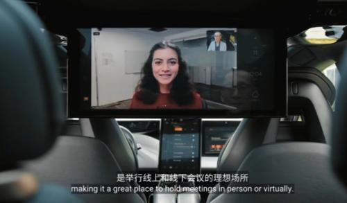 进入车内,满眼的大屏,除了15.4英寸的中控屏、仪表屏、副驾屏,后排还有一块27英寸的超大屏幕,车内能够实现移动办公、影音娱乐、游戏购物。