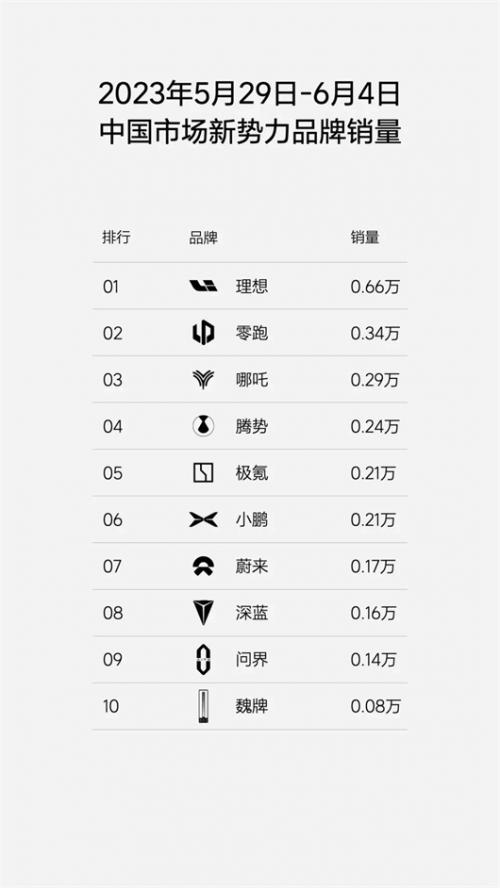 “2023年第23周(5.29-6.04)我们的销量达到了0.66万辆,远超其他新势力品牌,也超过了第二、三名的销量总和,蝉联中国市场新势力品牌周销量冠军。同时,我们已连续三个月交付超2万辆,本月将冲击3万辆的月销量目标。”