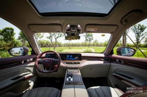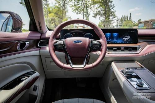 内饰方面,领裕内饰的塑造是从时尚与科技感开始的,双12.3英寸悬浮一体式智联屏无疑整个座舱最吸引眼球之处。设计师通过双色内饰、富有层次的仪表台、旋钮式换挡机构、真皮多功能方向盘,以及大量的木纹饰板、各处的装饰缝线、皮革和软包材质,提升了车舱的高级感。