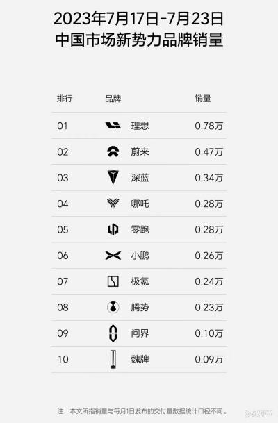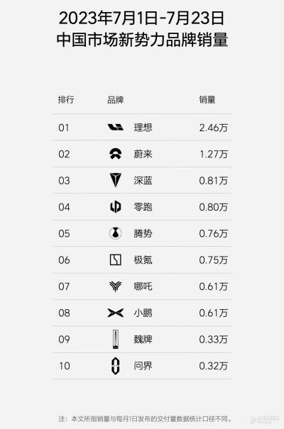 理想汽车发布最新的新势力周销量榜单