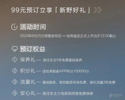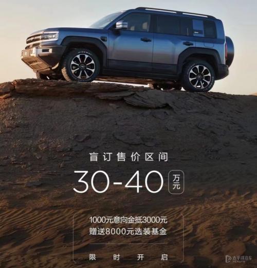 在2023成都车展上,方程豹豹5开启盲订,盲订区间为30-40万元,相比此前40万元左右预售价还要便宜。新车开启盲订的同时,还给出盲订权益,包括1000元意向金抵3000元,以及赠送8000元选装基金。