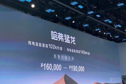 在2023成都车展,哈弗旗下全新中型SUV猛龙正式开启预售,预售价格区间为16-19万元。新车定位于新能源轻越野SUV,采用硬派设计风格,搭载1.5T Hi4插电混合动力系统,纯电续航最高145km。据悉,新车将会在9月中旬上市。