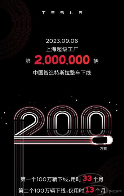 9月6日,特斯拉中国官方宣布,上海超级工厂第200万辆中国智造特斯拉整车下线,从第一辆整车下线到第200万辆下线,共用时46个月,其中第一个100万辆下线,用时33个月,第二个100万辆下线,用时13个月。