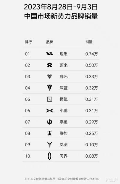 零跑和腾势周销量分别为0.29万辆和0.25万辆,需要加把劲。岚图和问界则处于倒数,成绩也比较一般,期待新款岚图FREE交付后能把销量提上来,问界则需要等新款M7上市。