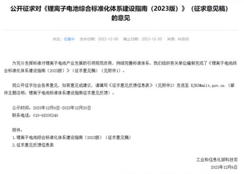 12月6日,工业和信息化部对《锂离子电池综合标准化体系建设指南(2023版)》(征求意见稿)公开征求意见。意见稿提出,到2028年,锂离子电池标准的技术水平达到国际先进水平,基本实现产业基础通用标准和重点产品标准全覆盖。