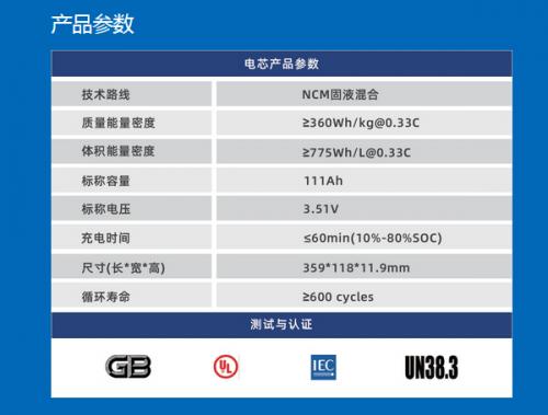 从电芯产品参数来看,蔚来这块电池采用的是NCM固液混合电解质,电芯数量达到384块,采用4并96串的高压连接方式,质量能量密度为360Wh/kg,体积能量密度为775Wh/L,标称容量为111Ah,标称电压为3.51V,只需要不到60分钟便可从10%充到80%SOC,其尺寸为359*118*11.9mm,循环寿命为600次。