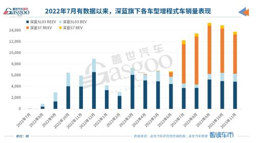 也正因此,长安汽车借增程乘上了新能源汽车发展的高速车。据盖世汽车研究院终端数据显示,作为首款搭载原力智能增程、原力超集电驱的车型,长安深蓝SL03自2022年7月上市以来销量逐步攀升,进入2023年后,更是在1-11月的增程式乘用车销量中脱颖而出,成为仅次于理想汽车三款车型的销量第四名。