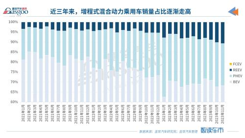 根据盖世汽车研究院终端数据显示,仅2023年前十一个月,理想汽车累计销量便近32.7万辆,较去年同期增长186.84%,独占我国增程式动力乘用车市场61.74%份额。