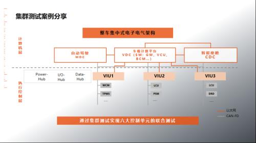 接下来是案例分享,我们希望向客户展示集群测试的客户价值。这是我们一个典型的区域架构案例。该架构有三个计算单元,但客户可以根据需要将其合成为一个或两个计算单元。我们提供MDC、VDC和CDC以及三个区域控制器,VIU1、VIU2、VIU3单元用于左右后区域的控制。
