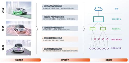 二是提升电子电器架构的效率,减少线束长度与重量,优化扩展接口,优化整车能耗。