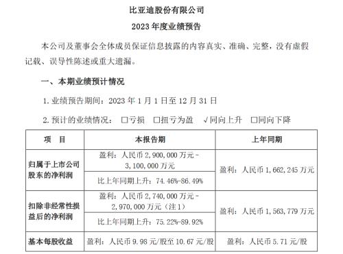 1月29日,比亚迪股份有限公司发布了2023年度业绩预告。