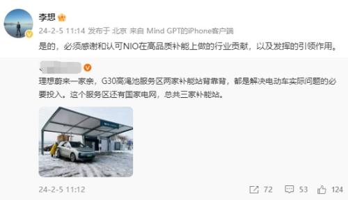 事情的原因是,有理想车主在某社交媒体表示,“理想蔚来一家亲,G30高渑池服务区两家补能站背靠背,都是解决电动车实际问题的必要投入,这个服务区还有国家电网,总共三家补能站。”