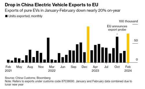 中国海关数据显示,今年前两个月,中国对欧盟27个成员国的电动汽车出货量略高于75,600辆,同比下降19.6%。