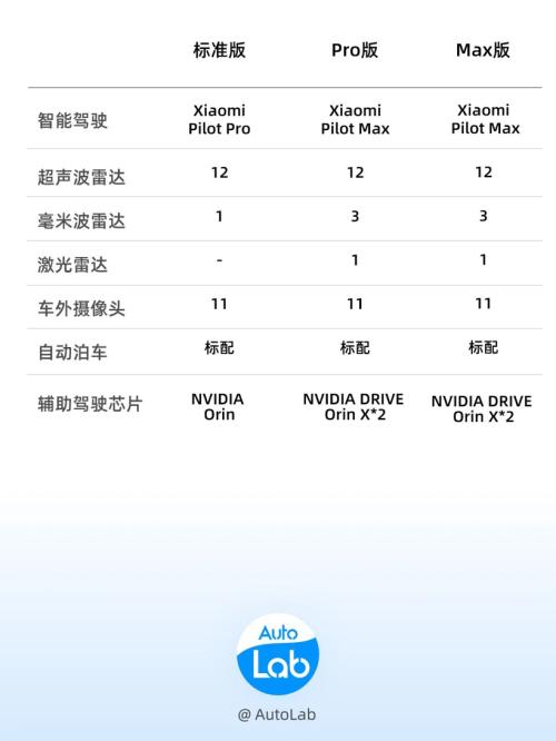 小米智驾Max则是基于两颗Orin X芯片和禾赛的激光雷达,总算力为508TOPS,属于主流的高阶智驾硬件方案,在Pro版的基础上,多增加了城市领航功能,应用到了Pro版和Max版车型上。