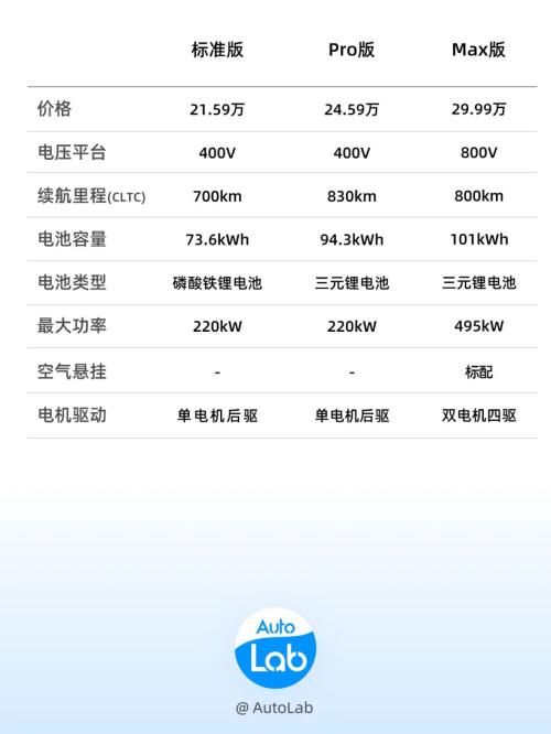 小米SU7一共有三个配置版本,分别是标准版、Pro版、Max版,其中前两款是400V平台,最后一款是800V平台。三个版本的配置和售价差异如下: