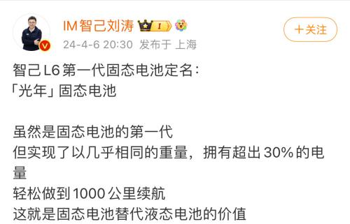 4月7日消息,上汽智己CEO刘涛于日前发布微博表示,智己L6第一代固态电池正式定名为“光年固态电池”。