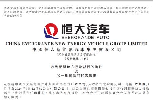 6月12日消息,恒大汽车在港交所发布公告,披露了其附属公司恒大新能源汽车(天津)有限公司(以下简称“天津恒大”)于近日收到了相关部门的告知书。