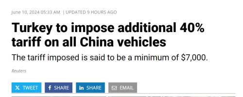土耳其贸易部在6月8日表示,将对所有从中国购买的汽车加征40%的关税,以遏制进口、保护国内汽车制造商并缩小经常账户赤字。去年,土耳其的经常贸易逆差为452亿美元。
