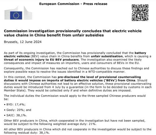 6月12日,欧盟委员会发文宣布了对中国电动汽车进行的反补贴调查的初步结果:“中国的纯电动汽车价值链受益于不公平的补贴,对欧盟电动汽车生产商构成了经济损害威胁。”在此背景下,欧盟披露了将对中国电动汽车加征的临时关税水平。