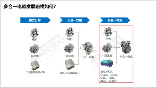 多合一电驱的发展路线是一个从独立分布到高度集成的演变过程。起初,车辆仅配备独立电机与高压电池,各部件分散布局,效能受限。随后,“三合一”方案涌现,将电机、减速器和电机控制器MCU集成,显著提升了效率与空间利用率。而今,“多合一”电驱方案更进一步,不仅集成MCU,还融合了DCDC、DCAC、OBC、PDU等关键部件,实现了更高度的系统集成。