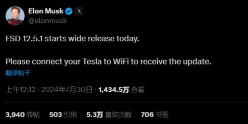 上周末,特斯拉FSD监督版v12.5.1向少数特定客户推出后,马斯克在7月30日证实FSDv12.5.1也将于7月30日开启更大规模推送。他上周还解释说,该版本FSD将首先部署在配备HW4的Model Y车型上,然后再扩展到其他车型。