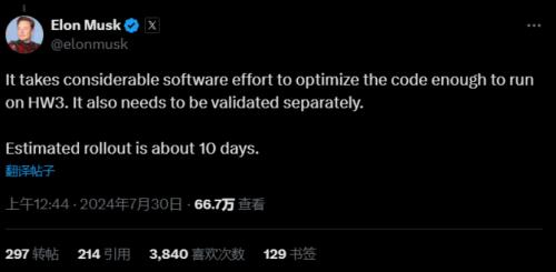 7月30日,马斯克还阐明了配备HW3的车辆何时会获得更新版FSD软件。马斯克称,由于这些车辆需要单独验证,预计大约还需要10天会获得此项更新。