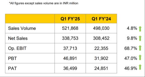7月31日,马鲁蒂铃木在一份提交给股票交易所的备案文件中表示,今年第二季度(4月至6月),该公司净利润同比大增46.9%,达364.99亿卢比(约合4.36亿美元),超过了彭博社327.2亿卢比的平均预期;净销售额同比增长9.8%至3,387.53亿卢比;营收同比增长了9.9%,达3,553.14亿卢比,也超出了预期;总成本同比上升5.6%至3,181.74亿卢比,而原材料成本同比增长了15.7%。