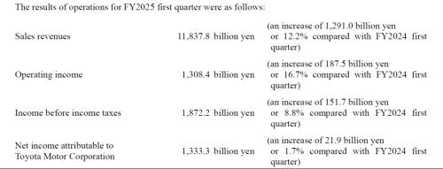 基于最新季度的财务表现,丰田汽车将维持此前的2025财年业绩预期。今年5月,丰田汽车高管预计,该公司2025财年全球零售总销量预计将从上一财年的高位下降1.3%,至1,095万辆;营业利润预计将下滑20%,至4.3万亿日元(约合267.4亿美元);净利润预计将下降27.8%,至3.57万亿日元(约合222亿美元)。