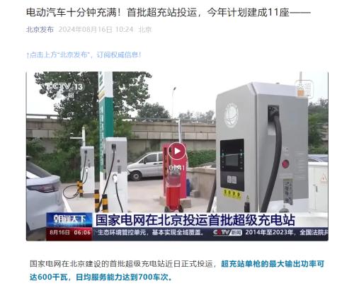 8月16日消息,据北京发布公众号显示,国家电网在北京建设的首批超级充电站于近日正式投运。