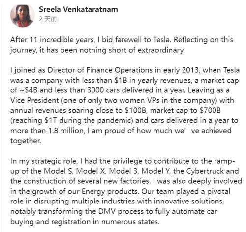 日前,特斯拉财务和业务运营副总裁Sreela Venkataratnam在领英上发布的声明中表示,“将从特斯拉离职,离开这家工作了11年的公司,休息一下,与家人共度美好时光,专注于个人幸福。”