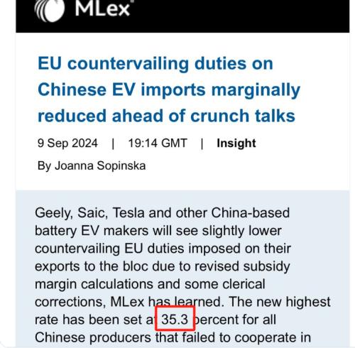 8月20日,欧盟委员会刚调整了对中国电动汽车的部分拟议关税,将对不配合欧盟反补贴调查公司的额外税率从37.6%降至36.3%,对其他配合调查的公司普遍加征21.3%的税率,对特斯拉的税率则从此前的20.8%大幅降至9%。