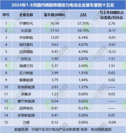 1-8月磷酸铁锂动力电池企业装车量TOP15中,也仅有宁德时代及比亚迪装车量突破了70GWh,分别为76.99GWh、71.53GWh,市占率分别为37.35%、34.70%。