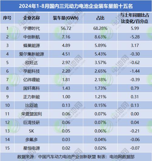 8月国内动力电池企业装车量TOP15企业中,有12家市占率环比上月实现正增长;1-8月国内动力电池企业装车量TOP15企业中,仅有6家市占率同比正增长,3家与上年同期持平,其余6家出现下滑。