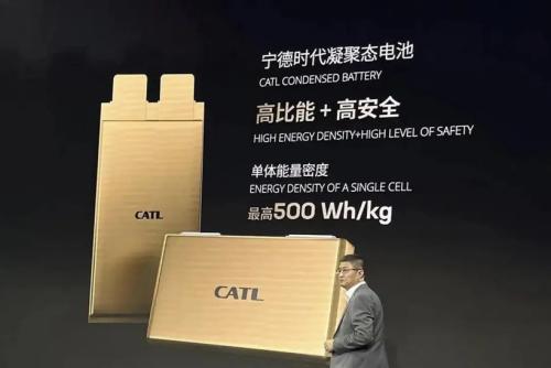 其实宁德时代早在2023年4月,就推出过凝聚态的电池,为民用电动载人飞机项目做开发,当时的能量密度已经能达到500Wh/kg。