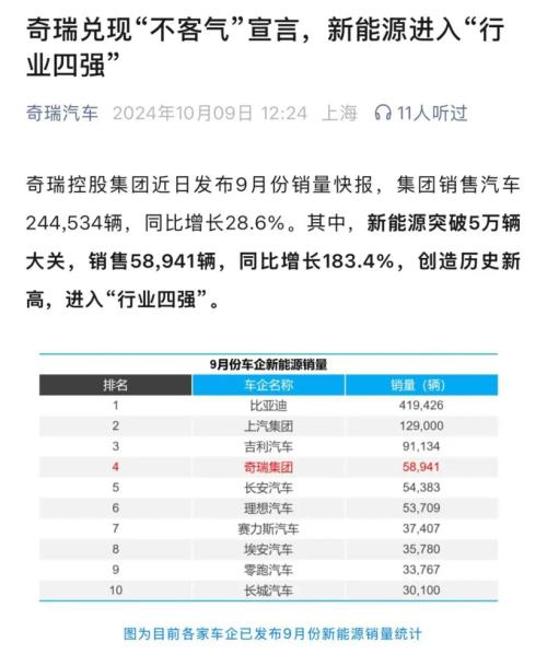 没想到奇瑞新能源今年开足马力,以电混为突破口,单月销量从3万、4万、5万,一路飙升到9月接近6万辆。