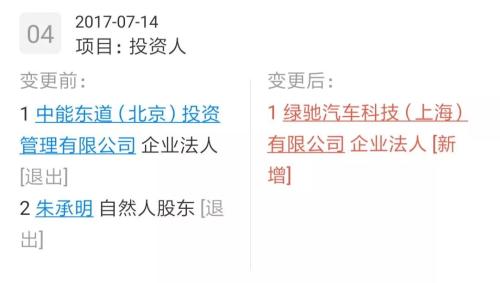 不过现在的绿驰汽车看起来已经与中能东道没有多大关系了,2017年7月,企业法人也由中能东道(北京)投资管理有限公司变更为绿驰汽车科技(上海)有限公司(现已更名为绿驰汽车科技集团有限公司,为绿驰汽车的主体)。