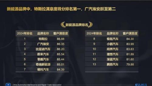 对于消费者而言,购车时“顾客是上帝”的服务体验虽好,但更重要的是售后服务能否跟上。这一点常常成为许多车主的心头刺,各大平台上关于售后的投诉也屡见不鲜。一直致力于提升售后质量的中国汽车维修行业协会,近日发布了2024年汽车售后服务客户满意度《CAACS卡思调查》结果,特斯拉、广汽埃安、比亚迪包揽前三。其中,广汽埃安成为新能源车主满意度中国第一品牌。
