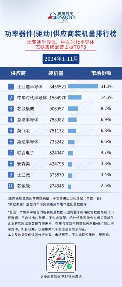 近期,盖世汽车研究院发布了2024年1-11月电气化领域供应商装机量排行榜,包括动力电池、电池PACK、BMS、混动发电机、驱动电机等9大领域供应商装机量排名,为行业提供最新市场数据参考。