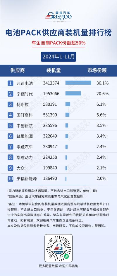 从数据可以看出,2024年初至11月,各大电池PACK供应商的竞争格局保持稳定。车企自制PACK的趋势日益明显,自制PACK份额超50%。弗迪电池以3,412,374套的装机量高居榜首,市场份额达到36.1%。紧随其后的是宁德时代,装机量达到1,953,066套,市场份额为20.6%。特斯拉则以580,191套的装机量位列第三,市场份额为6.1%。此外,国轩高科和中创新航分别以531,390套和335,596套的装机量位列第四和第五,市场份额分别为5.6%和3.5%。