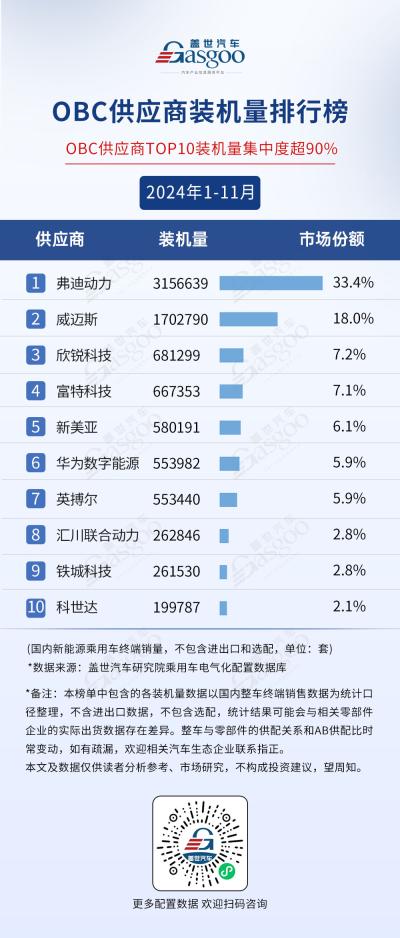 排行榜显示,弗迪动力以3,156,639套的装机量高居榜首,市场份额达到33.4%,显示出其在OBC领域的强大竞争力。紧随其后的是威迈斯,装机量达到1,702,790套,占据18.0%的市场份额。欣锐科技、富特科技、新美亚等企业也位列前十,市场份额均在6%以上。整体来看,TOP10供应商的装机量集中度超过90%,凸显了OBC市场的高度集中化竞争态势。(点击查看?OBC供应商装机量排行榜)