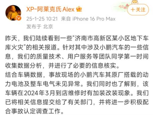 近日,小鹏汽车公关负责人@XP-阿莱克氏Alex在微博发文,针对近期山东济南市某小区车库内一辆小鹏汽车起火烧毁地库十几辆车一事进行回应。