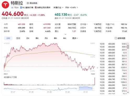 特斯拉当日股价收高1.08%,最高上涨4.88%,有分析师称股价已脱离基本面。