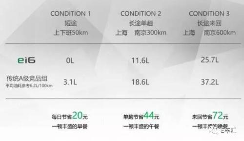 1.5L/100KM的油耗到底能省多少钱,我们详细的来算一下这笔账。从上海往返一趟南京大概600KM,荣威ei6能比传统A级竞品省72元钱。小编假设一个普通家庭一年大概能跑12000KM,那么就是省1440元钱,这钱足够保养几次了。
