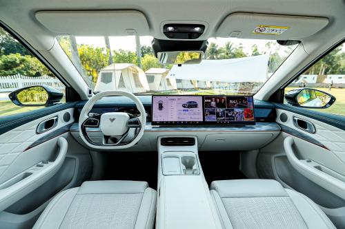 哪吒L的车内空间采用360°环抱式座舱设计,配合超越同级的大五座SUV体量、隐藏式仪表屏、双15.6英寸超窄边全高清屏“大彩电”、大量软质内饰,让驾乘空间更舒心。