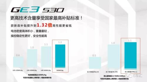 相比于旧版补贴政策只规定了续航里程大于一定公里就能拿到补贴不同,补贴新政对于续航里程有了明确的划分,续航里程低于150公里以下的纯电动车将不再享有补贴,续航里程在150-300公里之间的车型补贴分别下调20%-50%不等,续航里程在300公里以上的车型,补贴上调2%-4%不等。同时,在电池密度、百公里耗电上都有着更高标准的规范,只有同时满足以上规定才能拿到高额补贴。广汽新能源传祺GE3 530在新政实施前夜发布,将率先享受到国家最高级别补贴。
