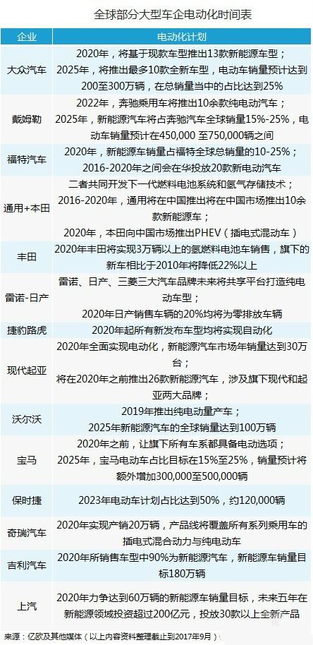 沃尔沃的全面电气化计划就像一根导火线,紧接着几乎每一家主要的汽车制造商都宣布计划迅速扩大自家混合动力车、插电式和纯电动汽车车型。上月,捷豹路虎也宣布,从2020年起其推出的每一款新车都将配备纯电或者混动版本。在今年的法兰克福车展上,宝马、戴姆勒和大众也都纷纷公布了自己雄心勃勃的电动化方案。