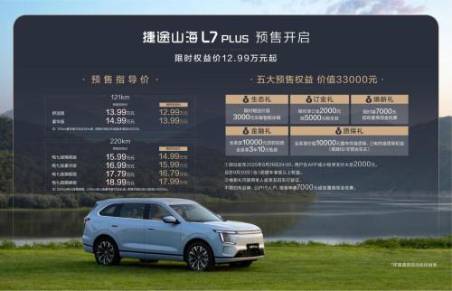 同时,捷途山海L7 PLUS正式开启预售,限时权益价12.99万元起。在此基础上,购车还享有价值33000元的五重预售权益,生态礼:限时赠送价值3000元的车载智能冰箱;订金礼:限时享订金2000元抵5000元购车款;焕新礼:限时享7000元超级置换现金优惠;金融礼:全系享10000元贷款贴息,全系享3年10万免息;质保礼:全系享价值10000元整车终身质保及三电终身质保权益(限首任/非营运车主)。山海L7 PLUS定位“长续航豪华电七座SUV”,全面覆盖用户的多元化需求,为用户带来超越期待的出行体验。